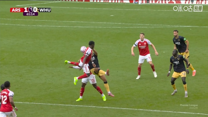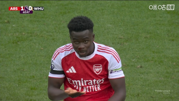 10月04日讯 英超第7轮,阿森纳vs西汉姆联。比赛第60分钟,萨卡被敌手打到脸部,鼻子出了点血。