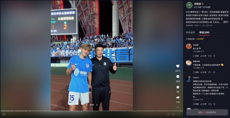 11月23日讯 2025赛季中超联赛在昨天落下帷幕,升班马大连英博以第11名的成绩截至了这个赛季。今天晚间,英博球员刘祝润更新外交账号,说念到了我方的2025赛季。