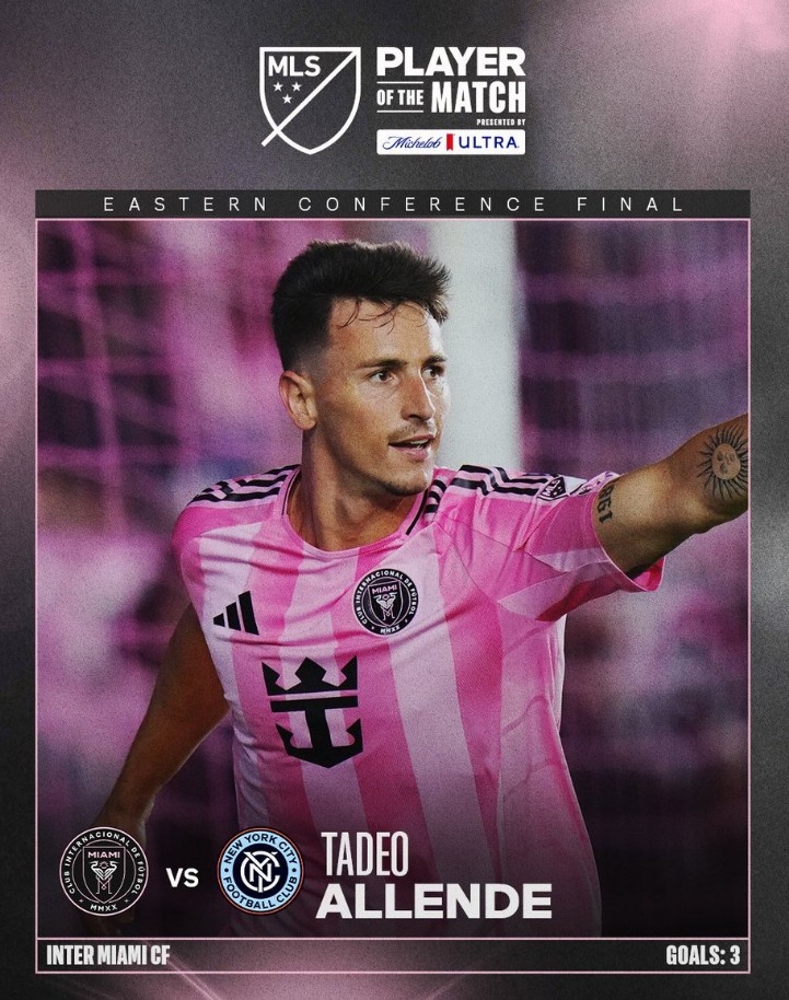 11月30日讯 迈阿密外洋球员阿连德匡助球队以5-1大捷纽约城FC,而且打入了他奇迹生计的第一个帽子戏法,追平了单赛季季后赛进8球的联赛记载。这场比赛也确保了迈阿密外洋将在12月6日主场迎战西部冠军温哥华白帽队,争夺MLS杯冠军。