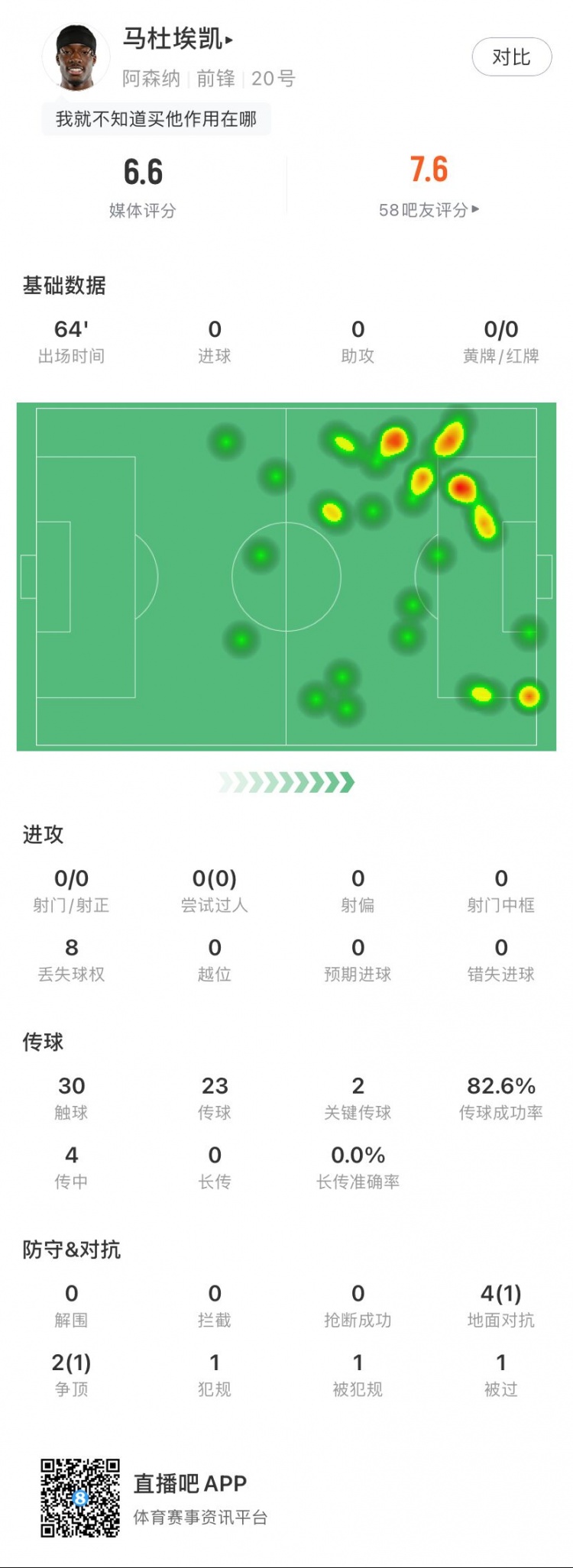 8月24日讯 英超联赛第2轮,阿森纳主场对阵利兹联。阿森纳球员马杜埃凯首发出场64分钟,以下为他在本场数据: