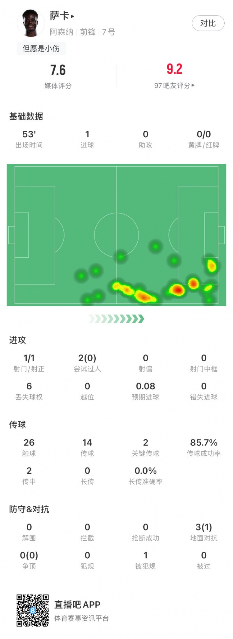 8月24日讯 英超联赛第2轮,阿森纳主场对阵利兹联。阿森纳球员萨卡上半场补时阶段破门,下半场第53分钟伤退。以下为他在本场数据: