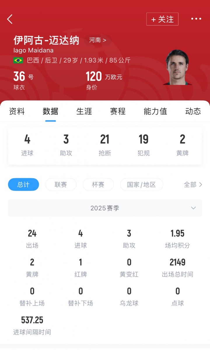 迈达纳现年29岁,巴西后卫,身高1米93。迈达纳前年2月解放身加盟河南,本赛季代表球队出场24次,孝顺4球3助。当今他德回身价为120万欧元。