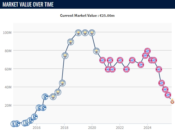 10月01日讯 德转本日更新了土超球员身价,其中今夏目田身从拜仁加盟加拉塔萨雷的萨内,身价从3200万欧跌至2500万欧。