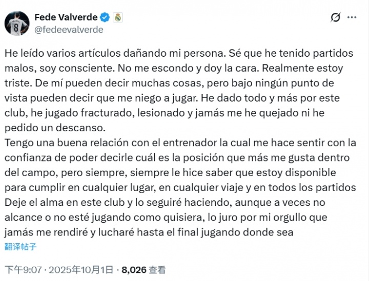 10月01日讯 巴尔韦德发布社媒,回复此前媒体报说念称我方拒却出战的说法,他示意我方与种植关系很好,愿为皇马付出一切。