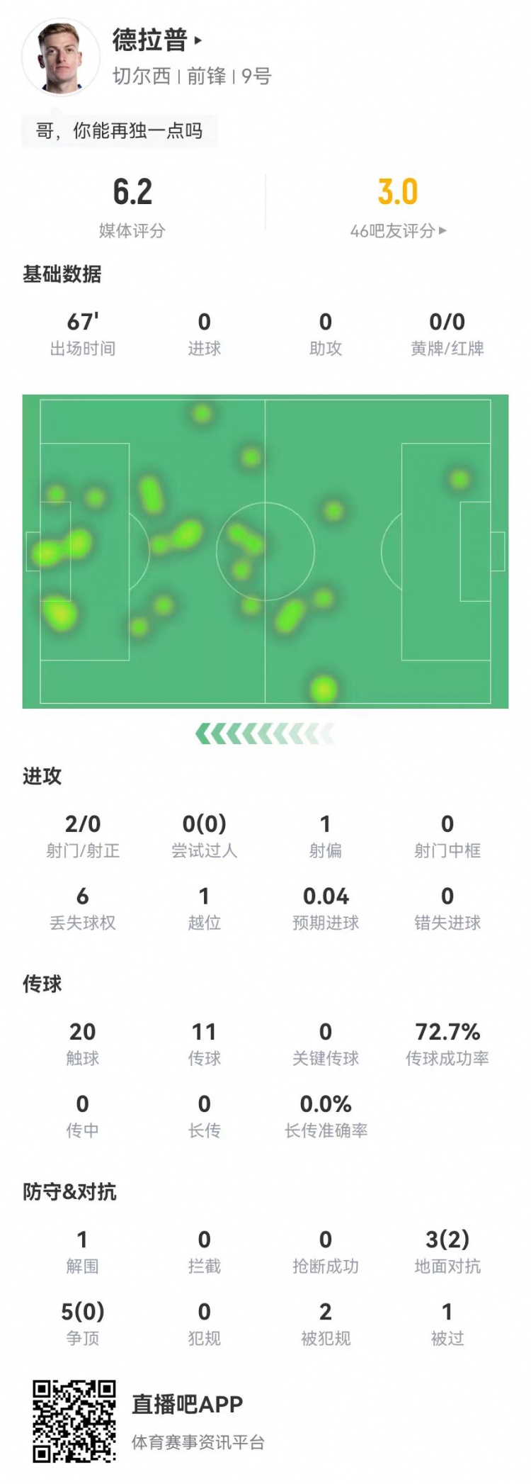 11月22日讯 切尔西在本轮英超对阵伯恩利,德拉普本场数据如下: