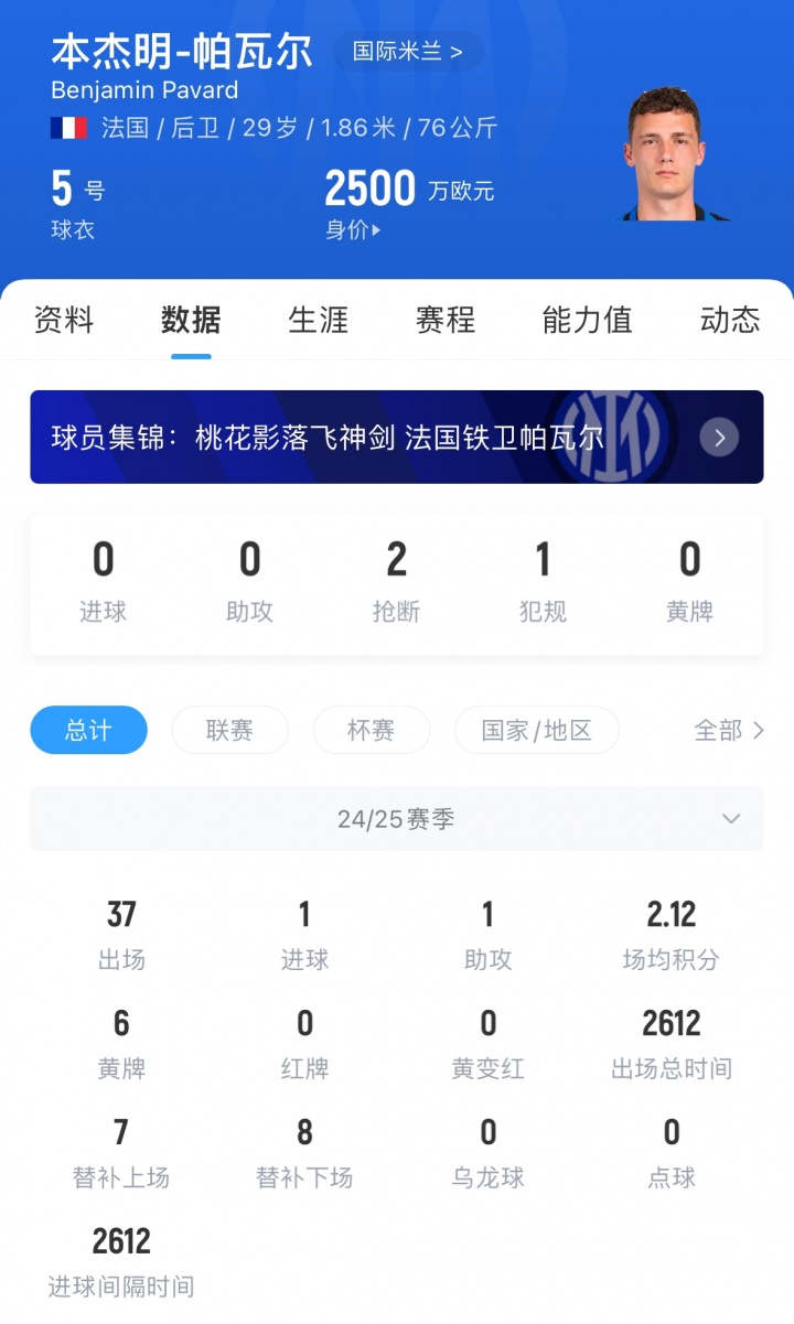 帕瓦尔现年29岁,2023年夏窗3140万欧元从拜仁加友邦米,截止现在共为国米出场70次,他的德回身价为2500万欧元。