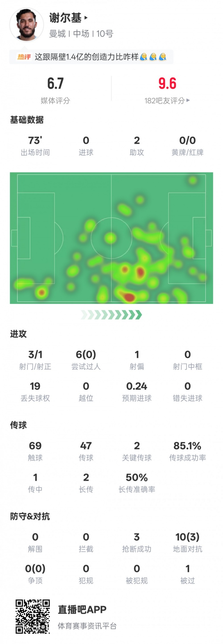 11月3日讯 2025-26赛季英超第10轮,曼城主场迎战伯恩茅斯。谢尔基首发出战,送出2次助攻,2次要道传球,还有3次抢断,评分6.7。