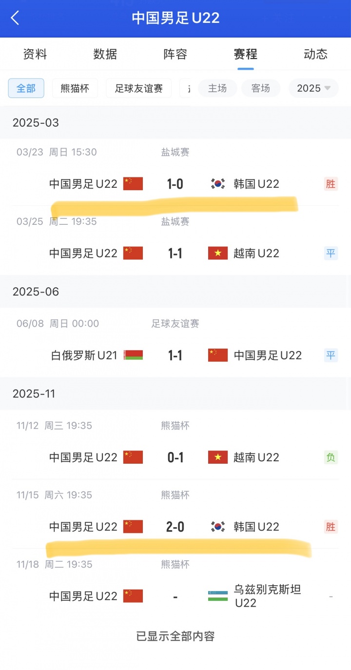 11月15日讯 当天熊猫杯U22国足2-0降服韩国,值得一提的是,U22国足本年两战韩国全胜,3进球+0失球!