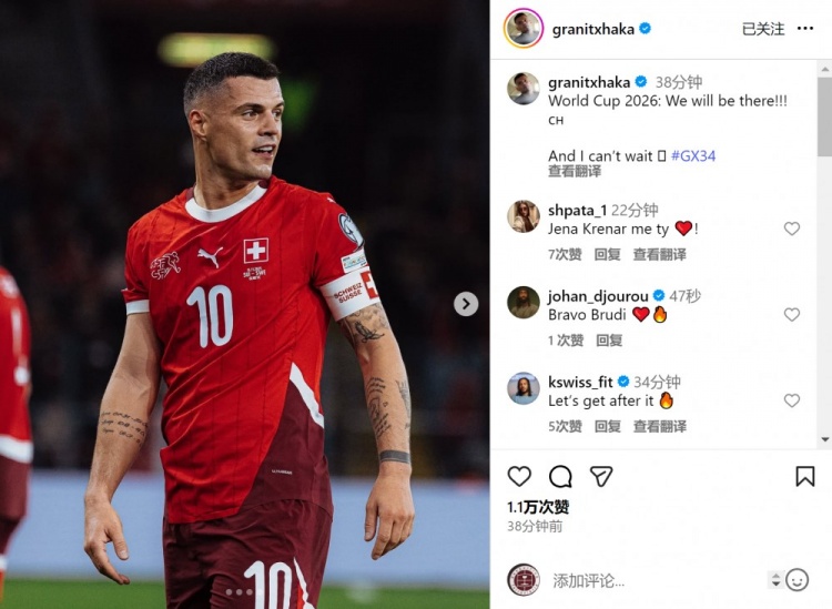 此役扎卡为瑞士首发出战,赛后他在酬酢媒体上晒出比赛像片,庆祝球队出线,配文:“2026年天下杯——咱们来了!我已迫不足待。”