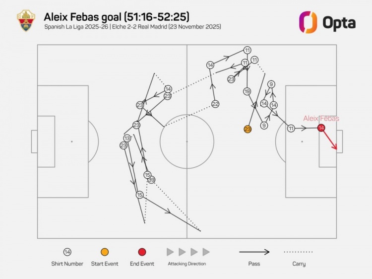 11月24日讯 皇马在本轮西甲2-2战平埃尔切,青训旧将费巴斯首开纪录。