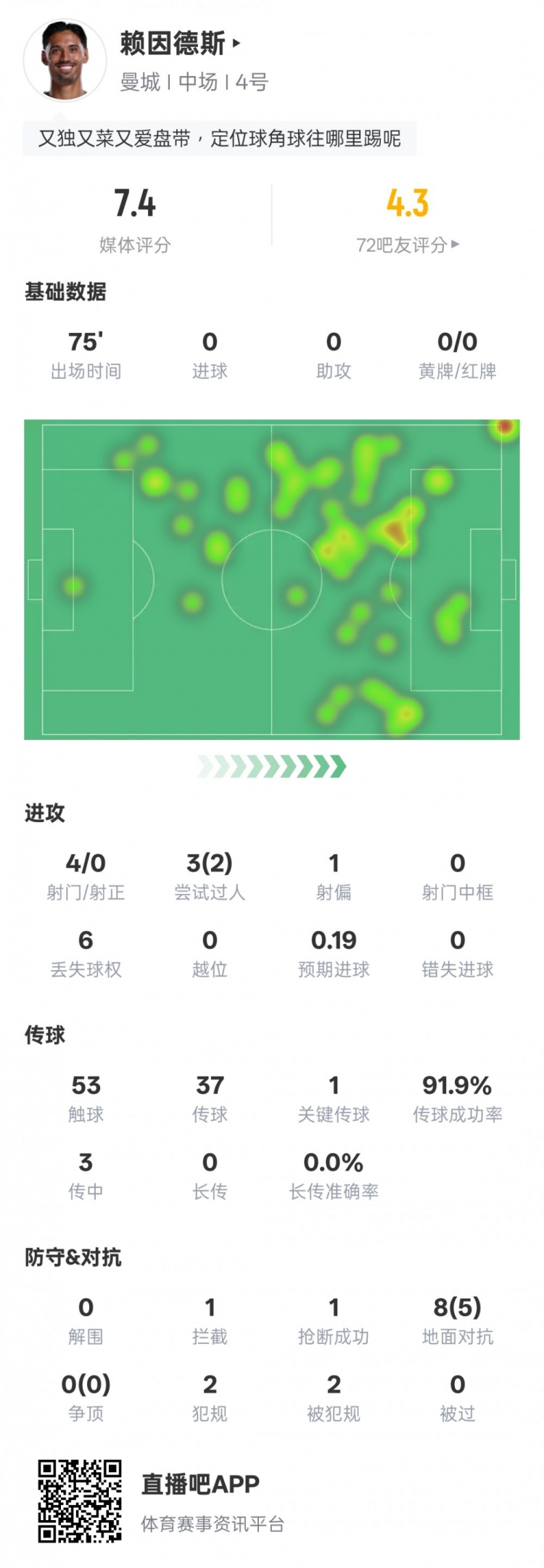 11月30日讯 英超第13轮,曼城主场迎战利兹联。赖因德斯首发出战,2次过东说念主收效,送出1次重要传球,传球收效用91.9%,评分7.4。