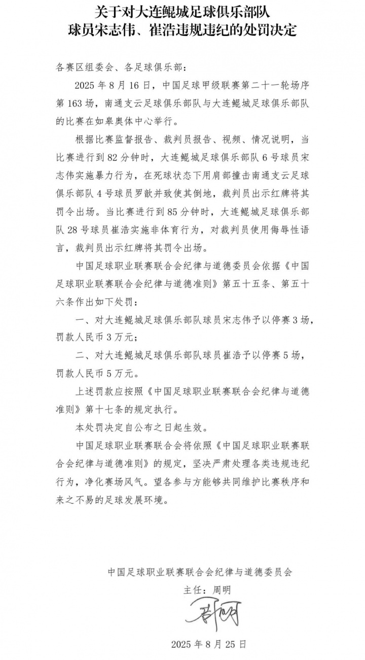 中足联发布罚单,对大连鲲城球员宋志伟和崔浩进行了责罚,其中宋志伟停3场罚3万,崔浩停5场罚5万。