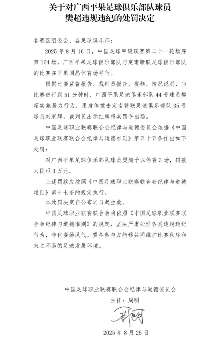 此外,在广西平果与定南赣联的比赛中,定南赣联王想寒犯规后有踩踏作为被出示红牌,他被责罚停3场罚3万。广西平果球员樊超一样因暴力行为停3场罚3万。