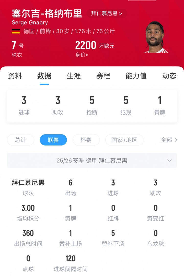 本赛季,由于穆西亚拉的受伤,孔帕尼将格纳布里更正为前腰,这一编削使得格纳布里感奋腾达,一改前两个赛季的恶运发扬。本赛季于今,格纳布里各项赛事为拜仁出场15次,孝顺3球5助,其中德甲6轮孝顺3球3助。