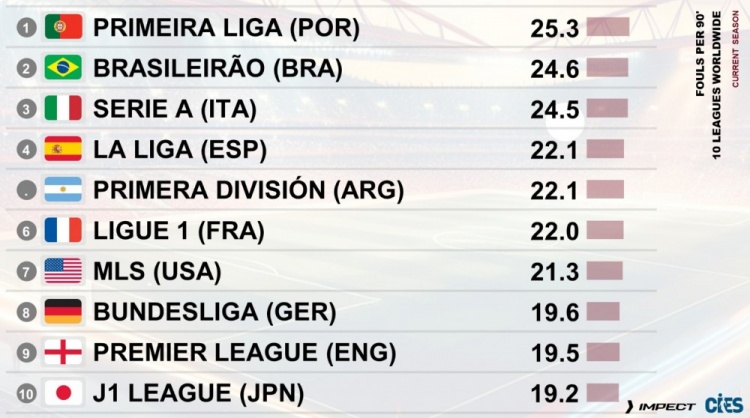 10月13日讯 CIES足球天文台统计了巨匠联赛每90分钟犯规情况,其中葡超以25.3次犯规位居榜首,巴甲则以24.6位居次席。