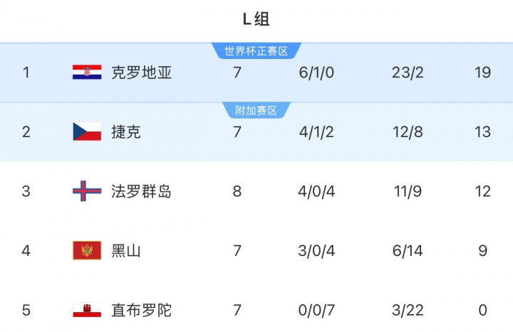 11月16日讯 世初赛欧洲区小组赛L组第9轮,法罗群岛1-3客负克罗地亚,8场小组赛杀青后已笃定无法插足前二,无缘2026好意思加墨寰宇杯。