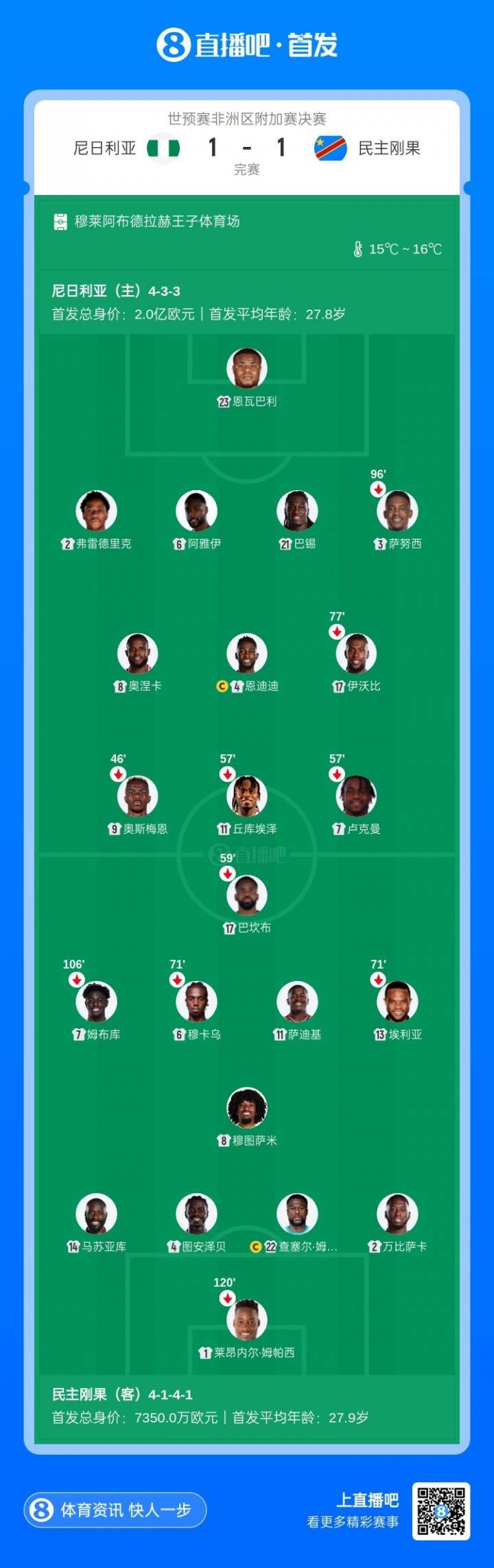 比赛第57分钟,丘库埃泽、卢克曼也一同被换下场。这也意味着,身价系数1.2亿欧的首发三时尚一皆被换下场。
