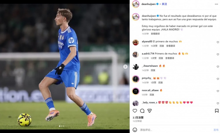 “我很交运能为这支伟大的球队打入我的首粒进球。马德里前进!”