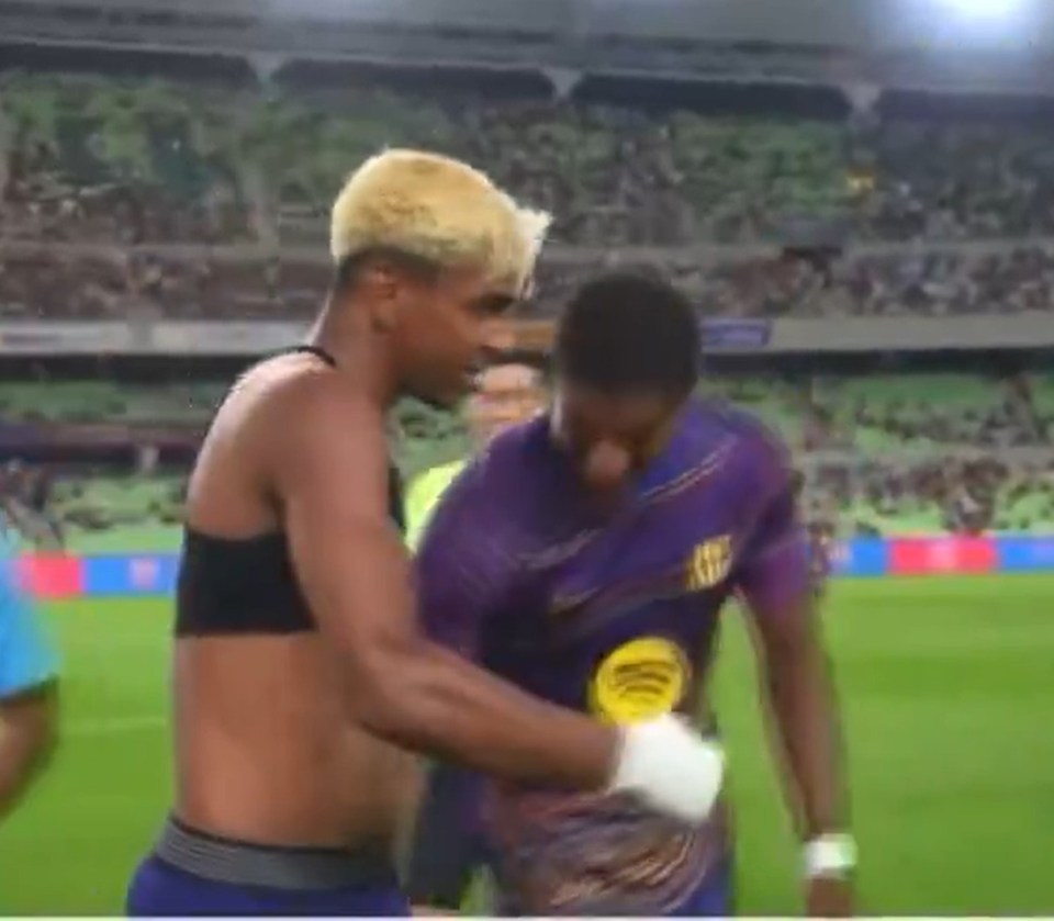 在出场比赛之前,27岁的英格兰边锋相当欢悦,在场上与新队友亚马尔开了个打趣。亚马尔是首发,半场休息时敌手还是迫不足待与他交换球衣。拉什福德以为很道理,也念念沾沾运说念,他走到18岁的西班牙边锋眼前,笑脸灿烂地与之击掌,而且还拍了拍对方的「黄金左脚」,似乎在寻求祝贺。