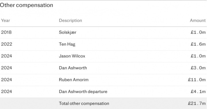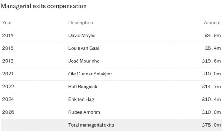曼联解任阿莫林使得他们自弗格森2013年退休以来在主帅解约金上的破耗接近1亿镑。阿莫林的协议还有18个月到期,他将获取1000万镑的抵偿。