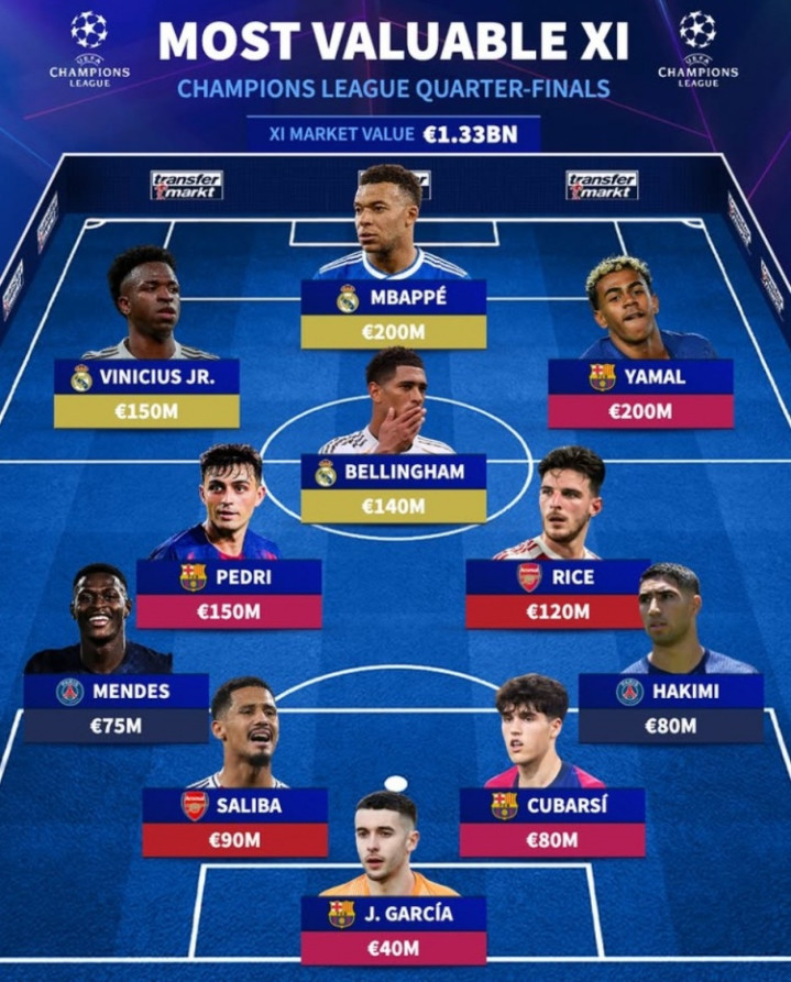 直播吧4月7日讯欧冠八强战即将打响,《转会市场》也列出了八强最贵阵,巴萨、皇马、巴黎、阿森纳包揽。