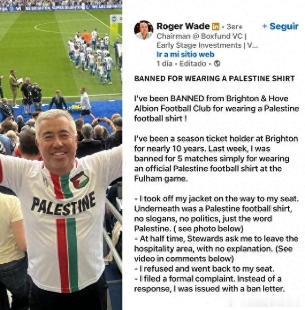 布莱顿赛季票捏有者罗杰-韦德(Roger Wade)社媒发文,暗示我方因身穿巴勒斯坦国度队官方球衣,被俱乐部禁赛五场。