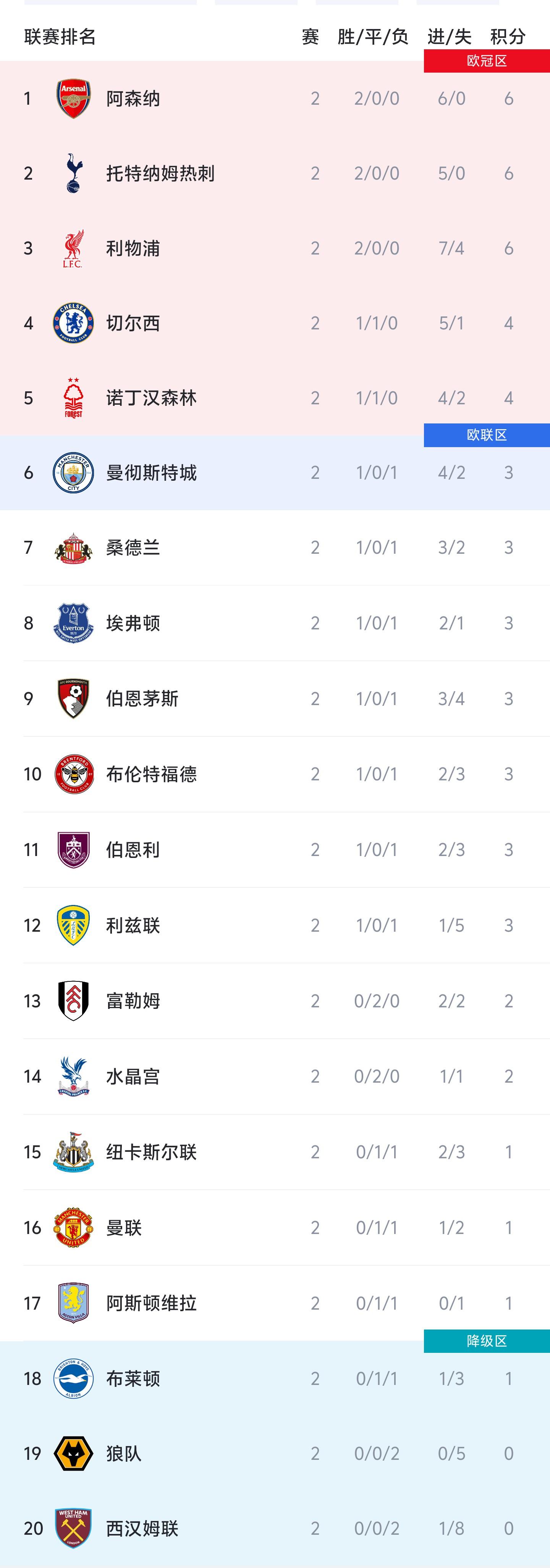 开局战绩欠安的曼联和维拉当今名循序16和第17,布莱顿、狼队、西汉姆联则暂时在左迁区内。