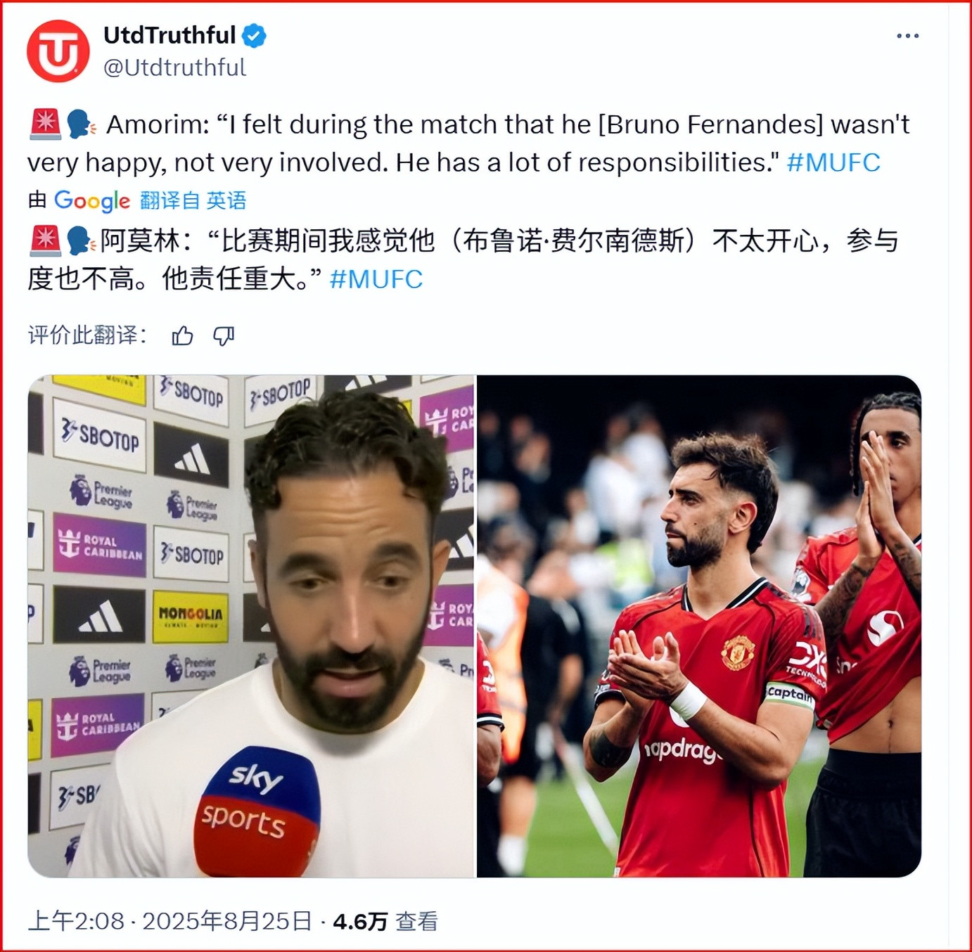 我知说念好多东说念主会说莫得B费,曼联上赛季就左迁了。然而我一直认为,凭借曼联的声势结构,就算主教化的策略再差,曼联也不至于到保级的地步。那么曼联存在什么问题?先听听曼联1-1富勒姆的赛后,阿莫林若何说的。