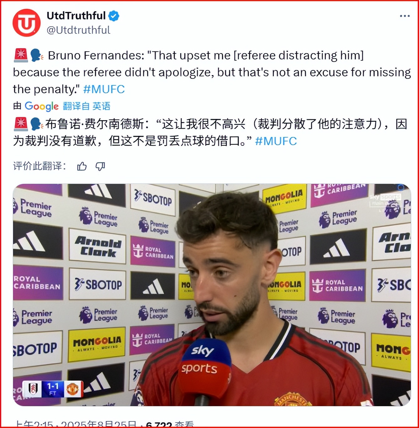 曼联1-1富勒姆,曼联队长的心态若何样?