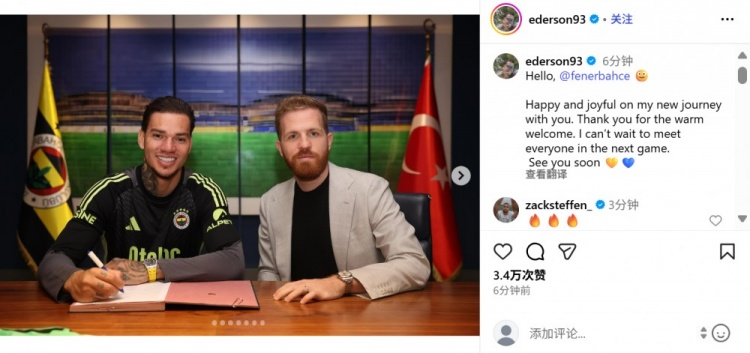 埃德森配文写说念:“Hello,费内巴切,对能与球队开启新的征途感到兴奋满足。感谢大家的热心宽待,我照旧迫不足待不才一场比赛与大家相逢。很快再会!”