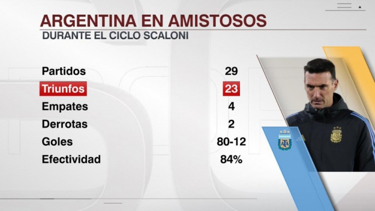 据ESPN统计,斯卡洛尼捏教阿根廷以来带队插足29场友谊赛,战绩23胜4平2负,打进80球丢12球。
