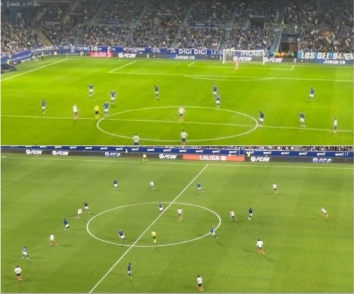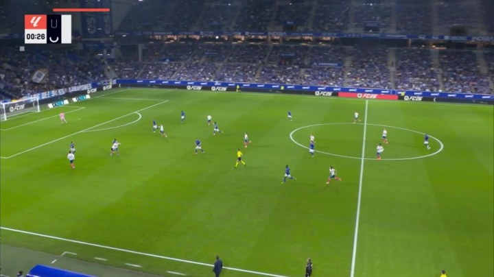 西甲未播出本场比赛的前25秒,主裁吹响开场哨后,镜头立时切到球场的鸟瞰视角,放了快要20秒才回到球场内,但给的是两边主帅特写。待到比赛画面复原,比分牌上的计时器知晓已是0分26秒。