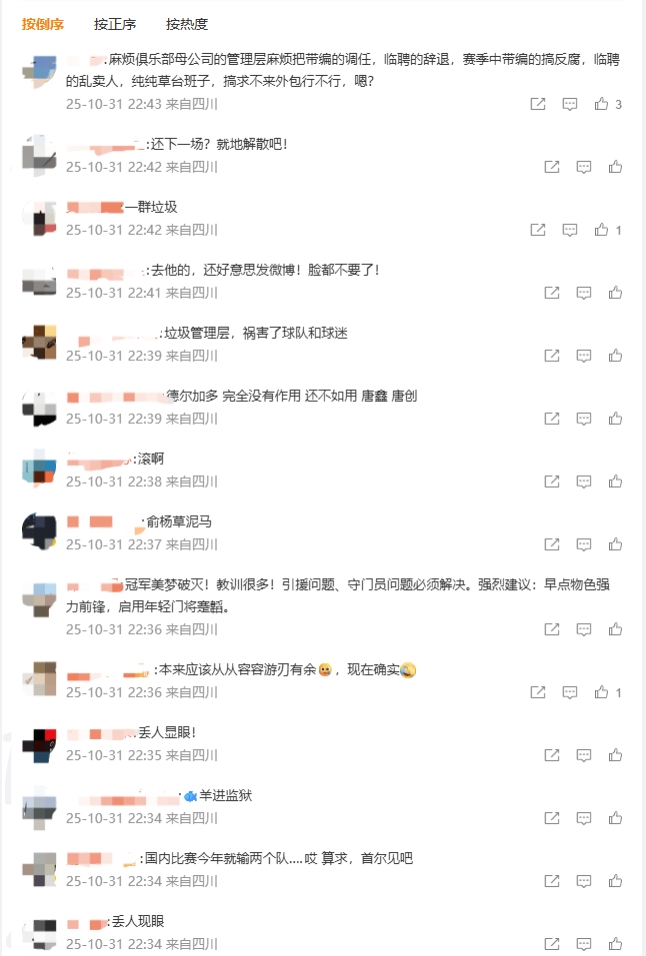 10月31日讯 中超第29轮,蓉城1-2遭河南逆转,剩1轮逾期4分退出争冠。比赛抑制后,大宗蓉城球迷涌入球队官博驳倒区抒发发火。