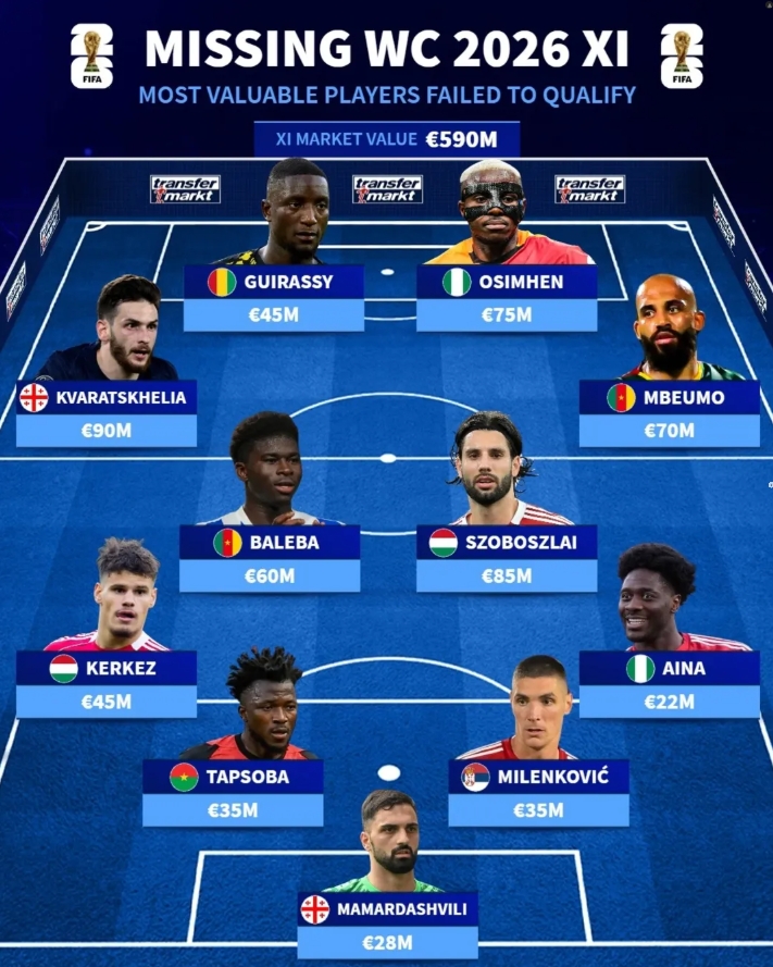 11月19日讯 当天德转社媒晒图,列出无缘2026天下杯球员中身价最高的首发威望,奥斯梅恩、姆伯莫、K77、索博斯洛伊等多名球星在列。
