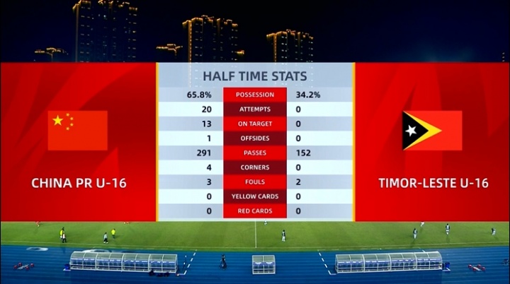 11月24日讯 U17亚洲杯预选赛A组第二轮,中国队半场6-0普及东帝汶。数据统计清楚,上半场场地十足一边倒。