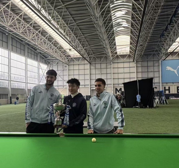赵心童携世锦赛冠军奖杯,与特拉福德、刘易斯在曼城磨真金不怕火场打斯诺克
