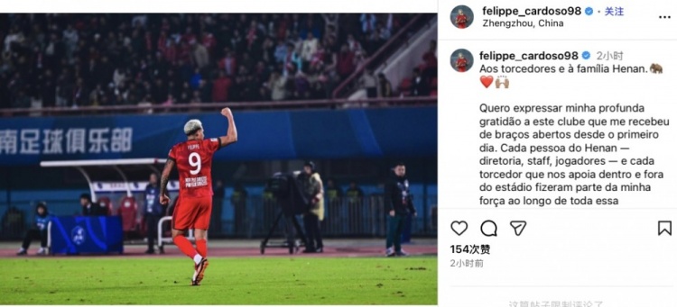 当天河南队外助费利佩·卡多索更新社媒激勉球队,他用西英双语写谈: