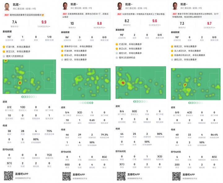 新赛季开赛拜仁前4场比赛,凯恩一起首发出场,孝敬6球2助攻。从球员的看成热区图上看凯恩险些掩饰全场,致使是回防到了己方禁区。
