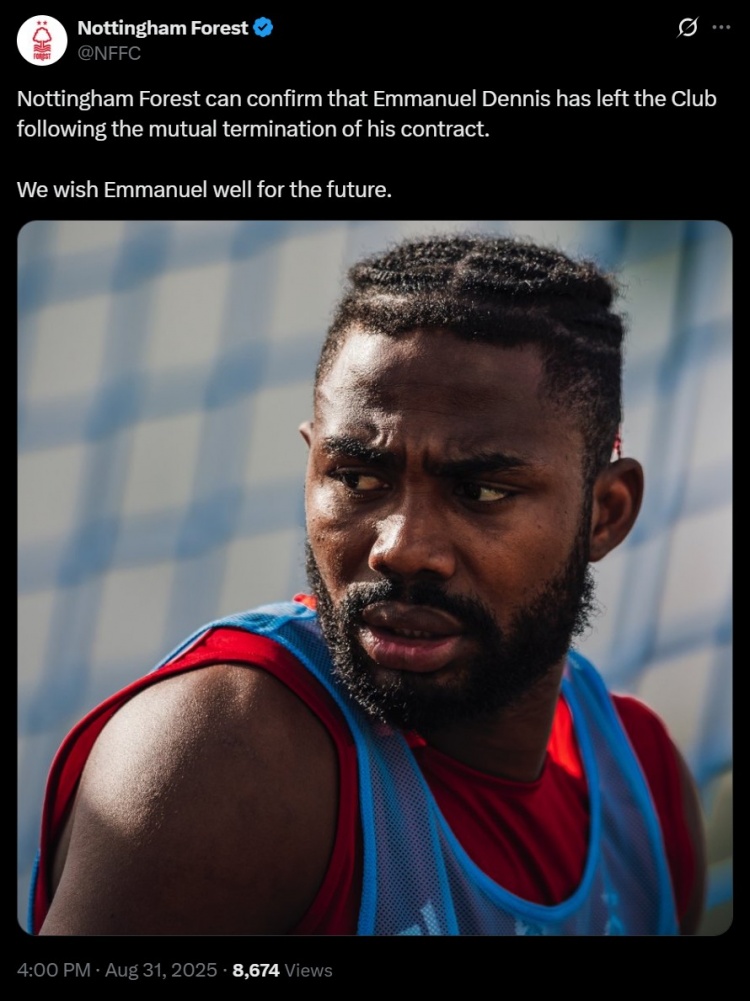 8月31日讯 诺丁汉丛林官方证实,伊曼纽尔-丹尼斯在条约隔断后离队。