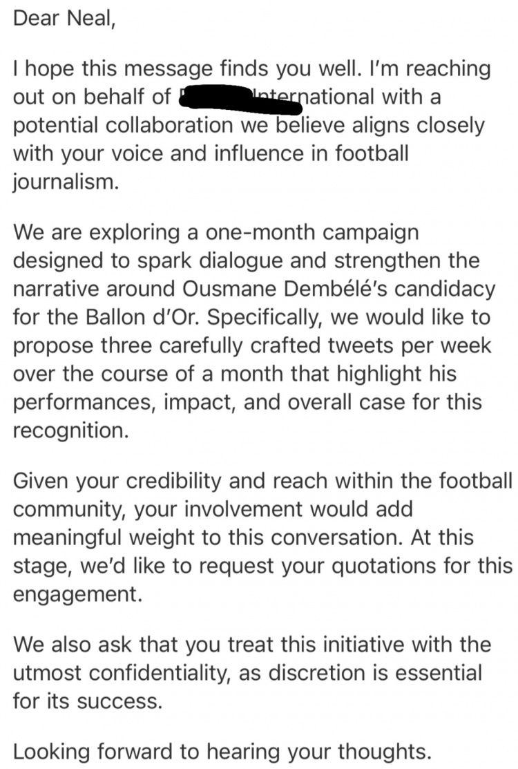 Neal社媒晒出公关公司的信函,并配文:“我最近被一家公关公司关联,对方但愿我作念一个有偿宣传活动,为登贝莱竞争金球奖造势。我不知说念资方是谁,但我合计这件事太造作了,是以必须把它说出来让众人知说念。”